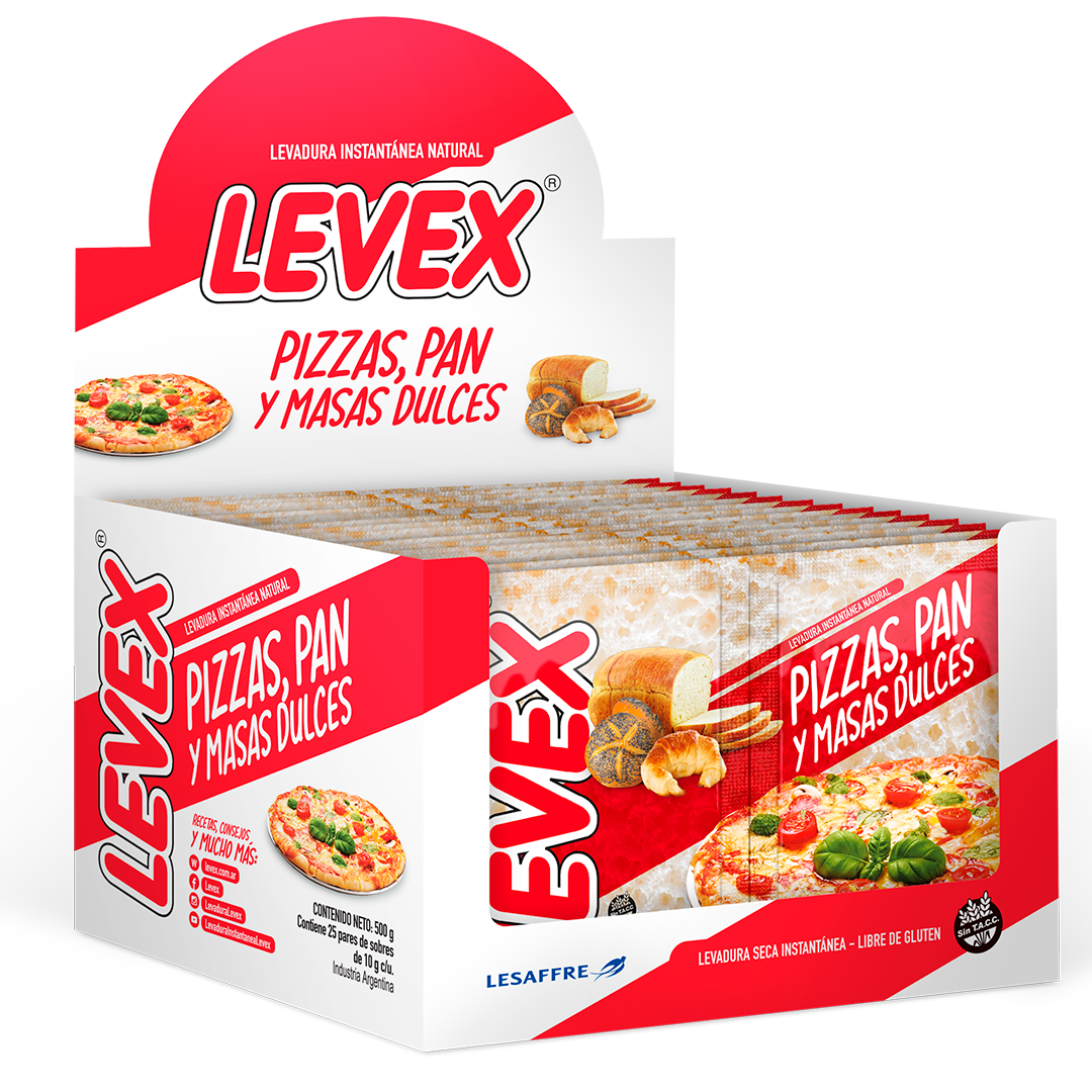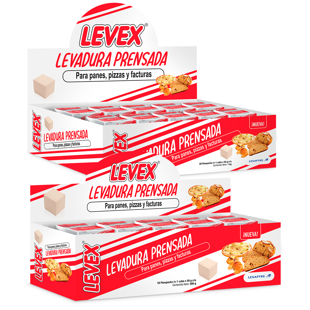 Levadura Fresca Levex® en Cajitas viene en dos presentaciones: display de 10 y 20 unidades. Además, podés adquirir Cajitas Levex en dos presentaciones de 6 Kg. Caja con 12 displays de 10 unidades y Caja con 6 displays de 20 unidades.